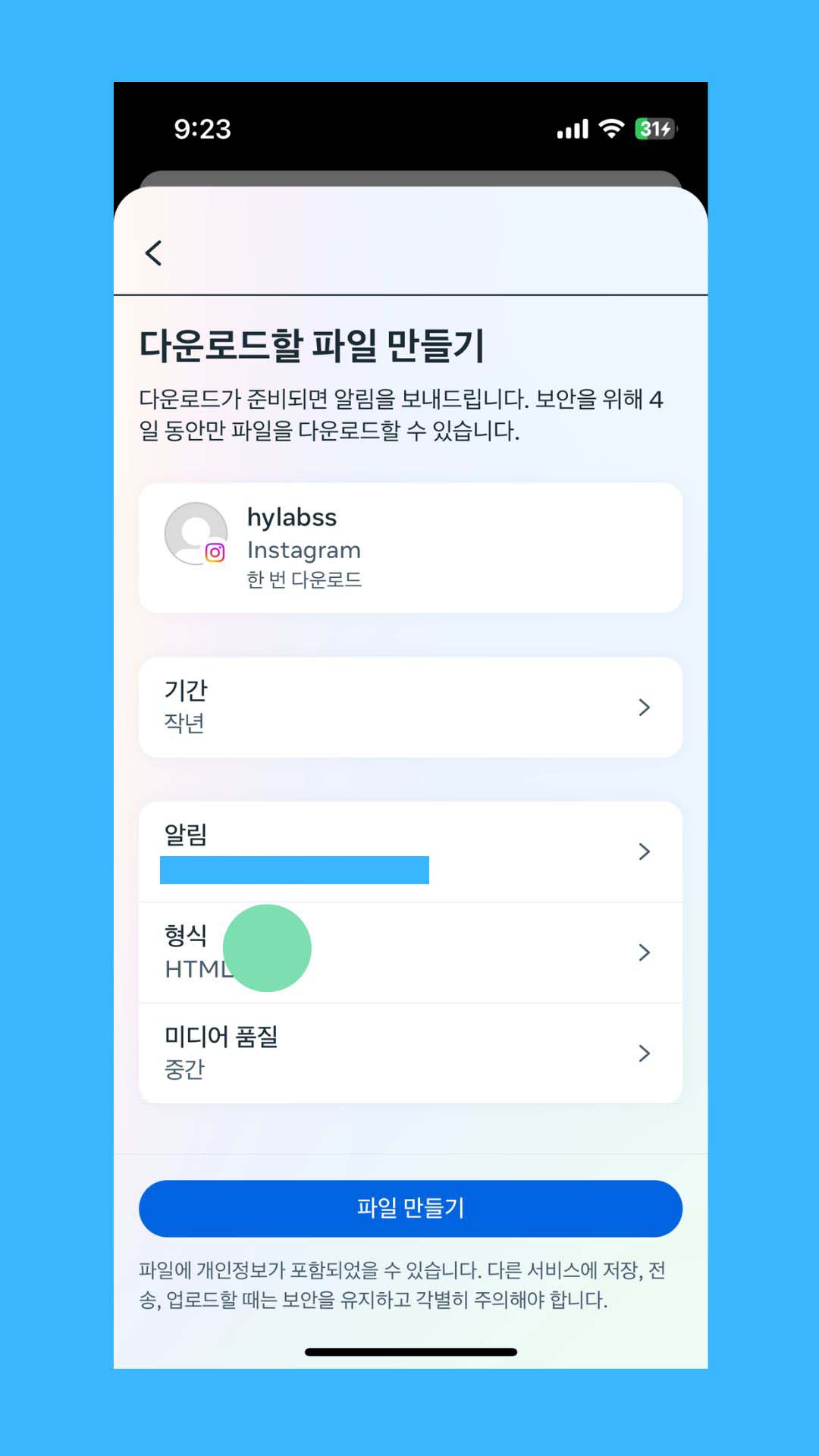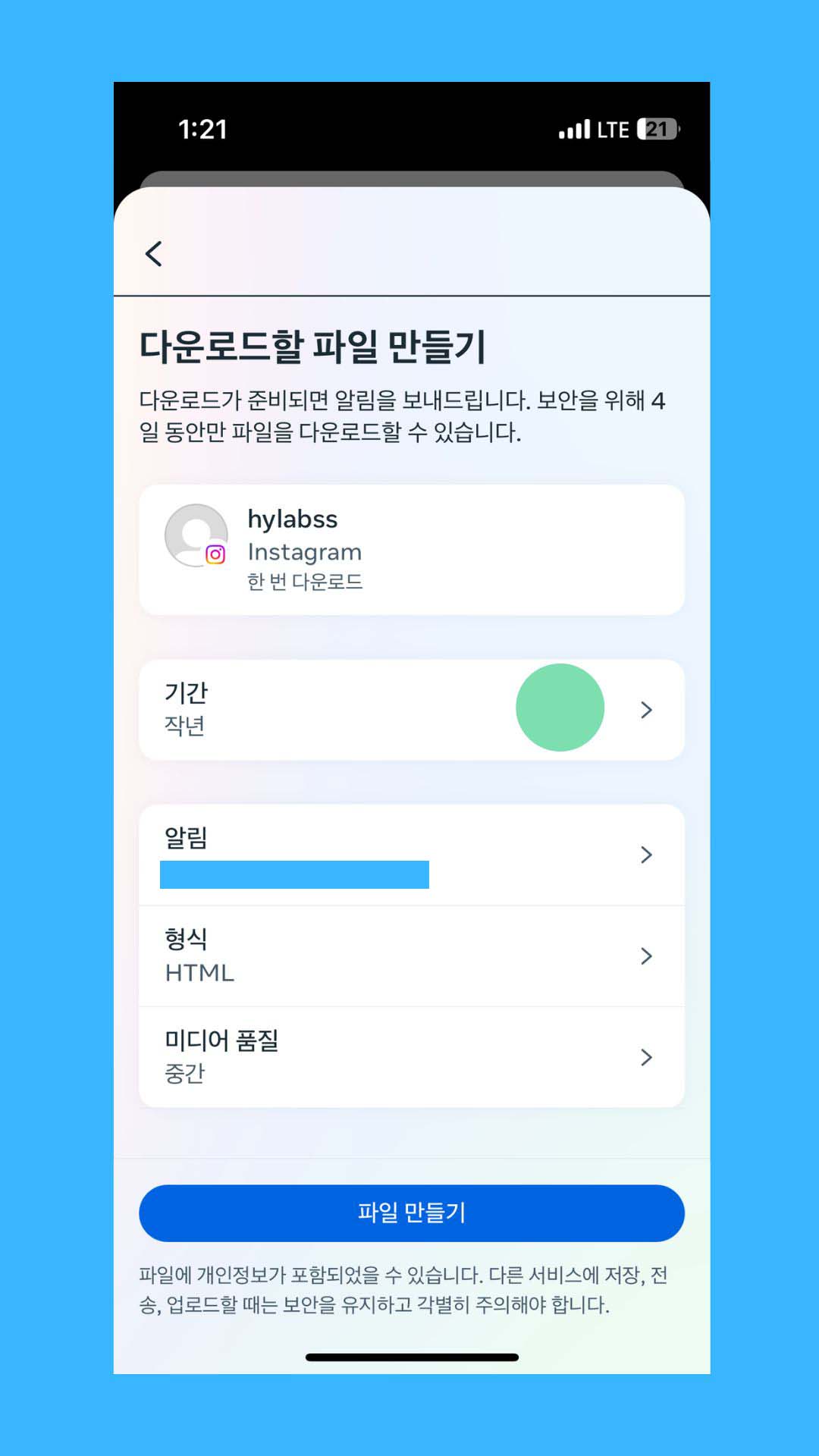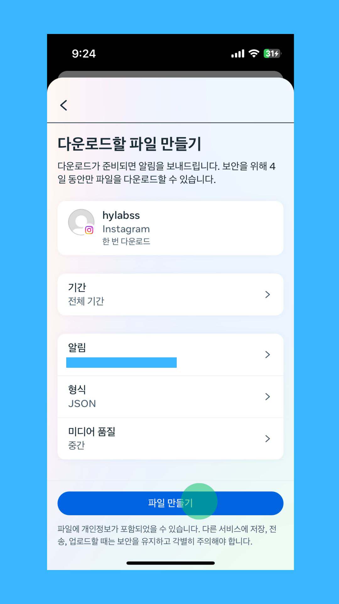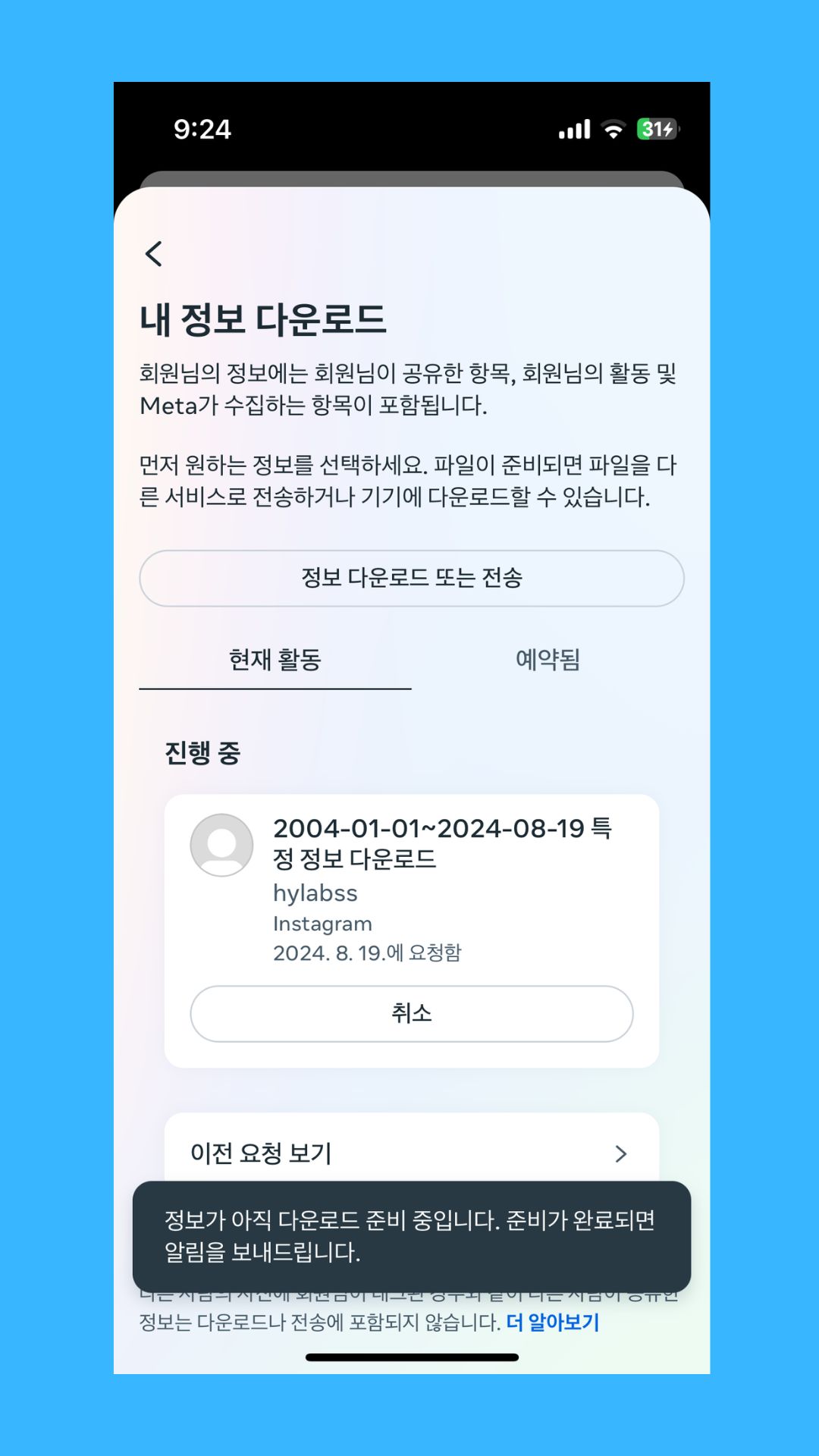 파일이 준비되면 다운로드 버튼을 선택합니다(준비까지 5분~15분 소요)