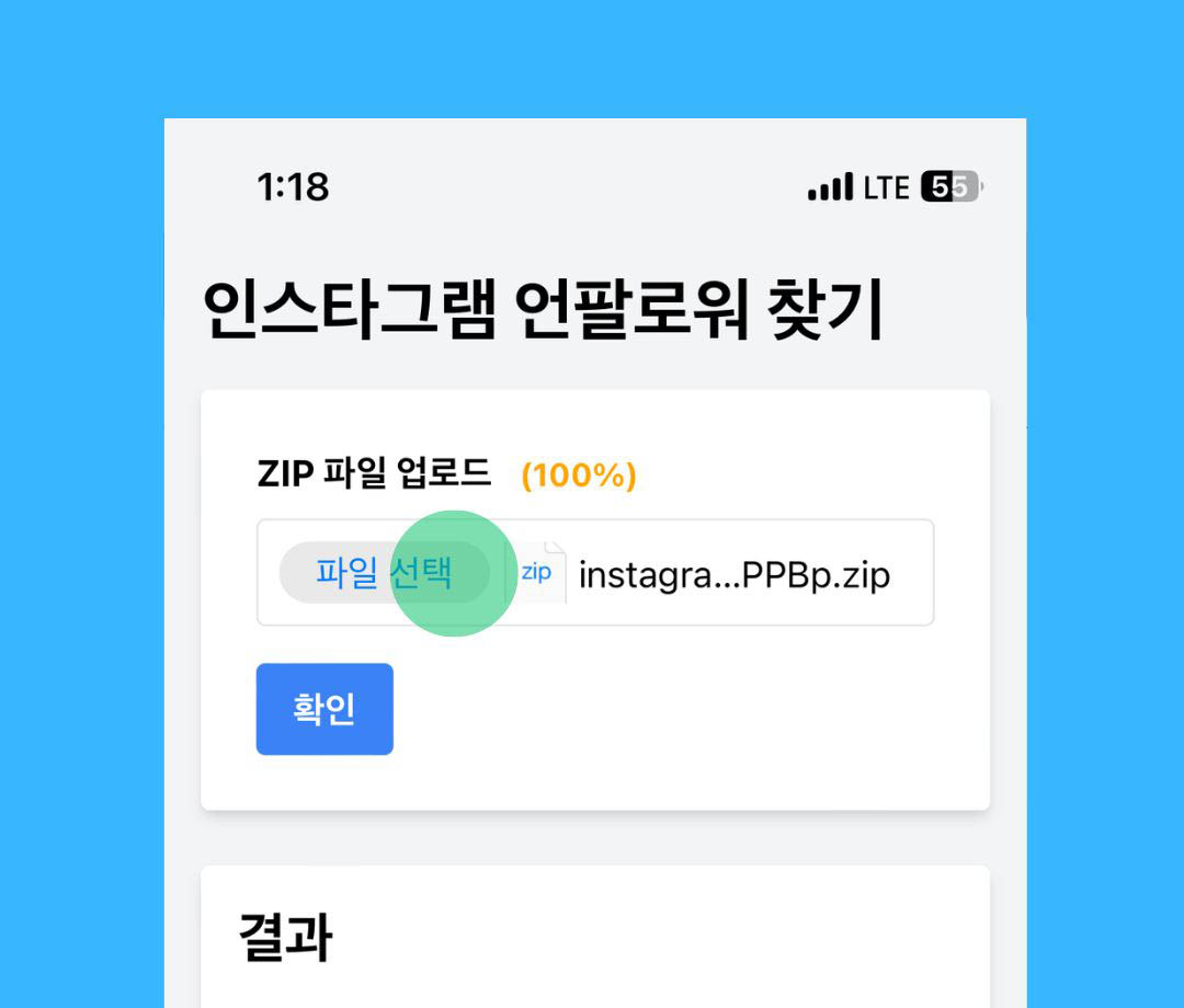 아래 본 서비스(언팔로워 찾기) 링크로 이동하시어, “ZIP 파일 업로드” 항목에 다운로드 받은 ZIP 파일을 업로드 하고 파란색 “확인” 버튼을 누르세요. 몇 초 뒤 화면 아래에 맞팔하지 않는 계정 리스트가 나타납니다.